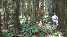 本丸周辺を見た後、車で下の射場まで戻って、今度はそこから徒歩で二ノ丸・三ノ丸を探索することにした。当初、三ノ丸の登り口が分からなくて右往左往したのだが、たまたま作業をしていた現地の方がお城好きだったようで、その後、案内してくれたのであった。ラッキーというか、本当にありがとうございました!