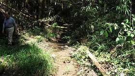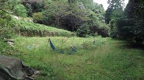 | 三ノ丸の内部。まったく手入れがされていない。 | 三ノ丸と北側の山稜の間の堀切には小川が流れている。 |