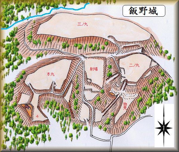 飯野城は、飯野小学校の北方にそびえる比高30mほどの山稜に築かれており、現在は亀城公園となっている。ただし、公園となって整備されているのは本丸だけであり、後の部分はヤブの中にあり、少なくとも夏場の探索は容易ではない。