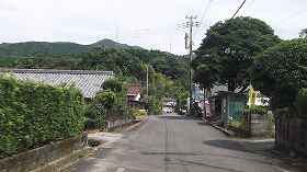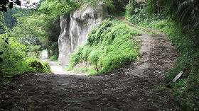 | 南側から遠望する加久藤城。比高50mほどある。 | 神社へと回り込む急カーブ。ここを通過できる車ならば、主郭の神社まで行くことが可能であるが、車で行くより、途中の遺構を見ながら歩いていく方がよい。 |