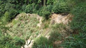 | 主郭西側の城塁は崩落した崖になっている。乗り出さないようにロープが張られていた。 | 主郭南側下の小郭にある虎口。 |