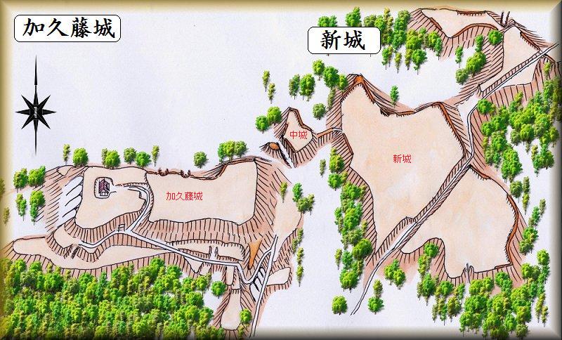 2郭から堀切を隔てて東側に「中城」があり、そのさらに東側には広大な「新城」がある。ここまでが広義の加久藤城であり、新城までも含めると、城域は非常に広大である。城主の勢力の大きさを想像するにあまりある城郭であると言っていい。