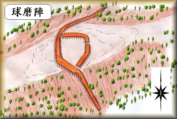 球磨陣は、山頂部分に直径50mほどの円形の土塁を巡らせ、そこから南北の斜面に竪堀を下ろしていくという独特の構造のものである。