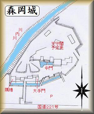 | 森岡城の前面。こんな立派なあやしい城は見たことがない! 大手枡形に架かる橋は二重橋であろうか。 |