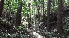 本丸への入口は、城址碑の先を200m近く進んだところにある。左手の山中に分け入っていく道が見えてくるので、これを進んでいく。入口がちょっとヤブになっているが、進んでいくと堀底通であることが分かる。中之城と高城との間の部分である。