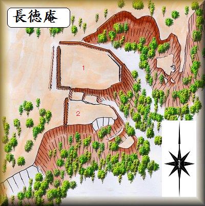 長徳庵とは城郭らしくない名称であるが、位置やその構造からして、城郭であることは間違いない。googlemapの航空写真を見ると、土塁が明瞭に見えている。堀ではなく土塁で構成されていることから、城ではない名称になったのであろうか。