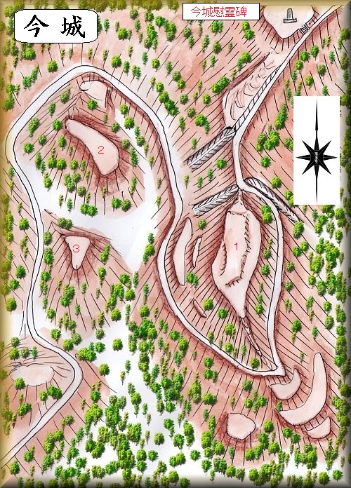 今城は川内川の西側にそびえる比高110mほどの山稜に築かれている。城址のすぐ北側に今城慰霊碑が建てられており、そこまで車道が付けられている。