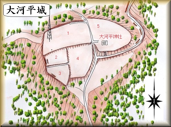 大河平城は大河平氏の詰の城というべきものである。大河平氏は平素は山麓の館に居住していたが、非常時にはこの山城に逃げ込むことにしていたという。