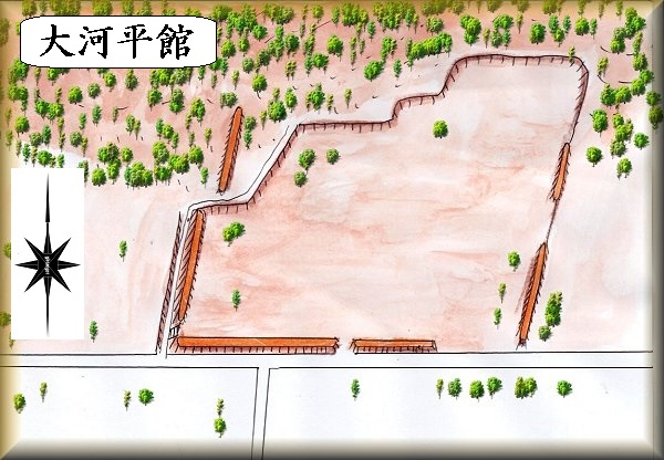 大河平館は、大河平の集落の北側、山稜を背後に控えた平野部に築かれている。かつては小学校の敷地となっていたようで、館跡の大部分はグラウンドとなっている。