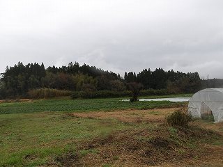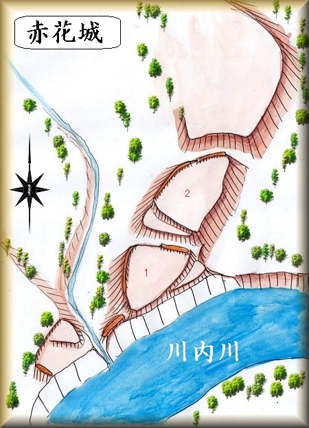 赤花城は、川内川に臨む河岸段丘上に築かれていた。堀切によって区画された2郭構造の城館だったようだが、現在では耕作化のために堀はほとんど埋められてしまっている。