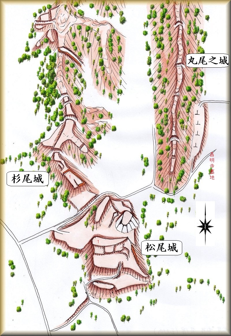 松尾城の場所。 杉尾城の場所。 丸之尾城の場所。