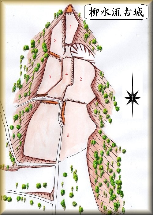 柳水流の集落の北端に突き出している比高15mほどの台地先端部が古城と呼ばれているところである。えびの市には他にも「古城」があるので、こちらを柳水流古城と呼ぶことにする。