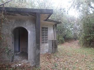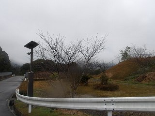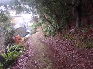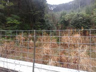 ところが、北側の山麓一帯には柵が巡らされており開口部が見つからない。さらに裾部には水路が巡っている。そのうえ内部はかなりのヤブのようだ。そしてこの日はかなりの土砂降りになってしまっていた。