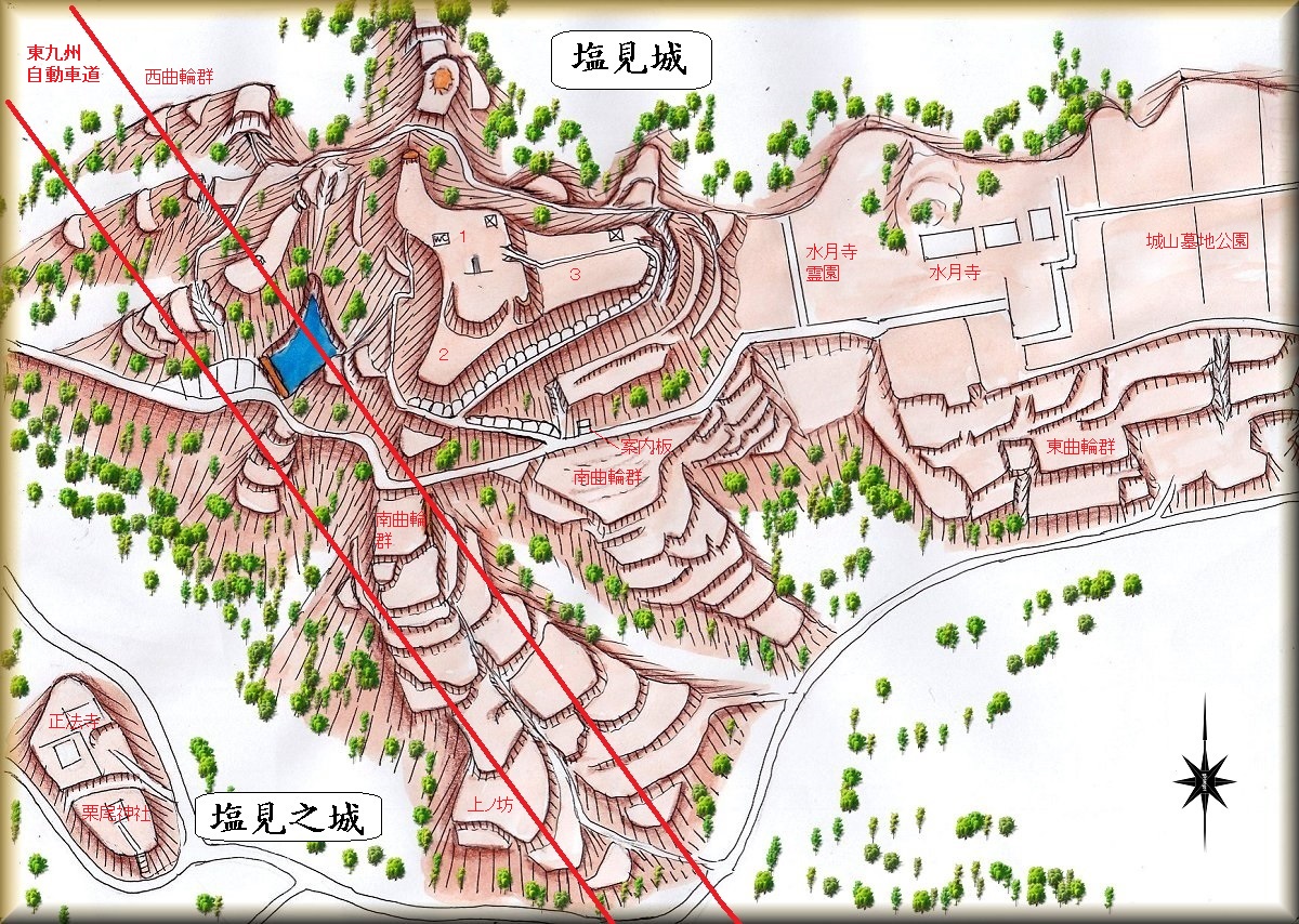 塩見城は、水月寺の西方にある比高80mほどの山稜全域に築かれた広大な山城である。