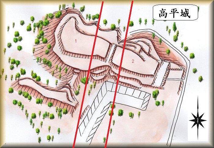 高平城は、塩見城の北西700mほどの場所にある。比高20mほどの台地を利用したものである。