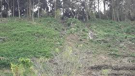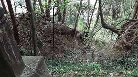| 南側の斜面の木が切られていたため、竪堀がよく見えた。これは第3・4空堀から続くやつである。 | 一番西側にある第7空堀。ヤブでよく分からない。 |