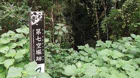 西側の部分から台地上に上がって行く。するとすぐ道路脇に「第7空堀」といった標柱が見えてきた。その脇はただのヤブである。ではあるが、内部を覗き込んでみると確かに堀があった。ただし、ヤブの中であるが・・・。