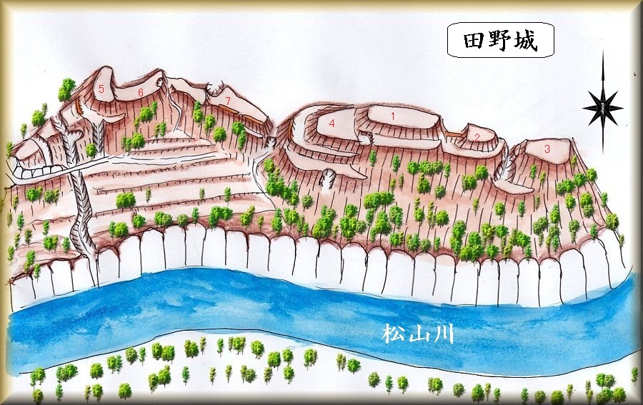 田野城は松山川の北側にそびえる比高50mほどの山稜先端部分に築かれている。