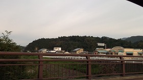 | 南側の五ヶ瀬川に架かる橋から遠望した松尾城。 | 三ノ丸に続く東側の段郭。 |