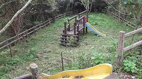 | 本丸内部。石碑がたくさん建てられている。 | 本丸から下の段に行く城塁は滑り台で降りるようになっている。 |