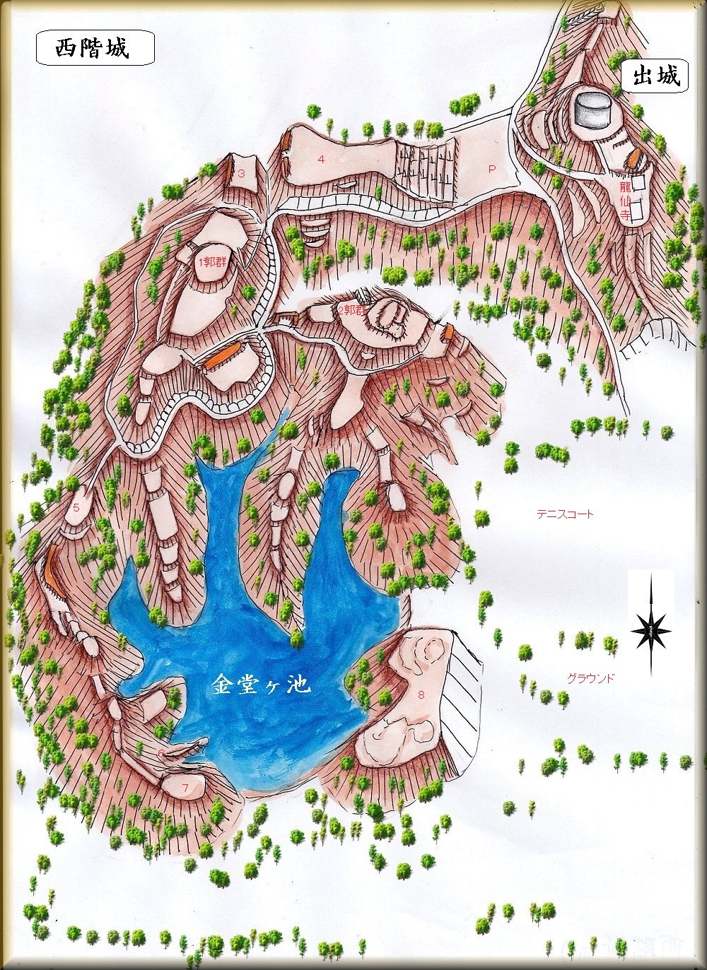 西階城は金堂ヶ池の北側の比高40mほどの山稜に築かれている。広大な山稜の全域を加工したかなり大規模な城郭である。