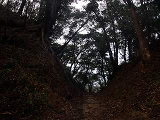 道路は4郭の側面部を通って登って行く。南側が深い谷戸部になっており、その先にも2郭群の城塁が見えている。