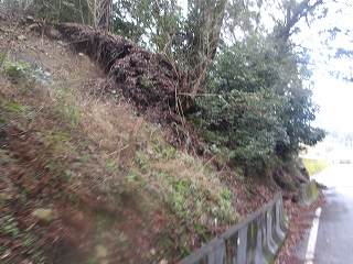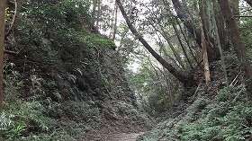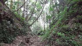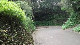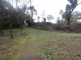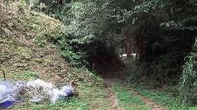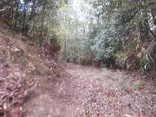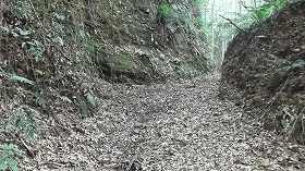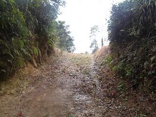 そこから道は2つに分かれる。3郭に進む道と、右手の横堀状の通路に進む道とである。2郭を経由して行こうと思っていたので、ここで右側のルートを取る。この道は車道として開かれたようで、斜面は近代の重機によって削られているようだ。
