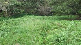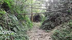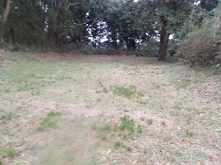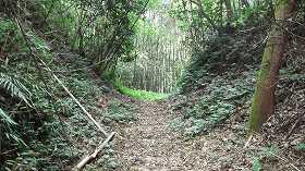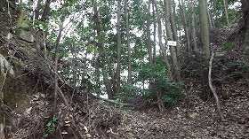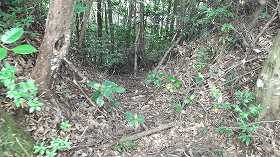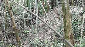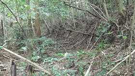 | 1郭城塁。2郭と1郭との間は二重堀となっている。本丸は猛烈なヤブである。 | 2郭と3郭との間の堀切。3郭もヤブだらけでまともに歩けない。 |