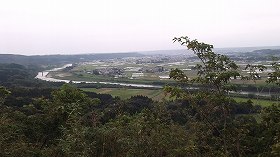 | 2郭内部。この郭だけ、ヤブが取り払われており、城址碑や案内板がある。 | 2郭から遠望した風景。平野部がよく見える。この先に西都原古墳群がある。 |