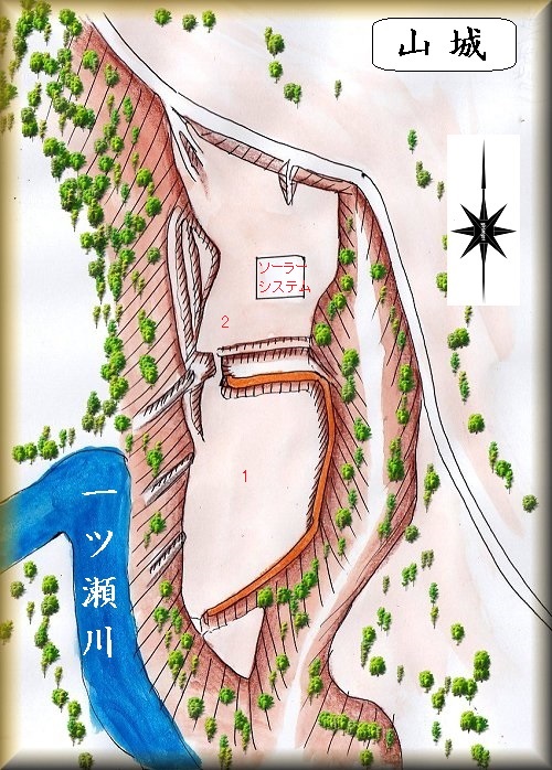 2の部分の先に城塁と虎口が見えており、そこから入ったところが1郭内部である。