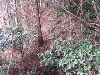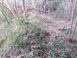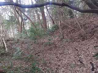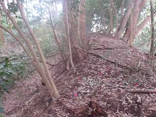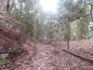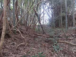 その手前には堀が掘られており、堀の外側に土塁が盛られている。しかし、この堀もそれほど深いものではない。どうも、尾根続き部分からの敵の接近についてはそれほど警戒していなかったようである。