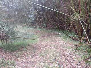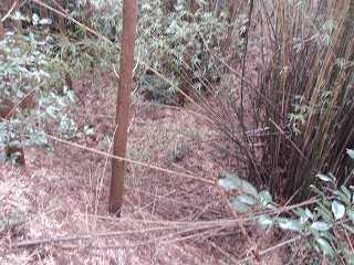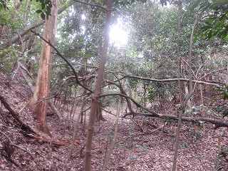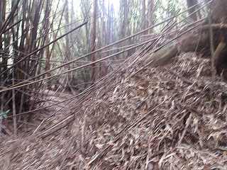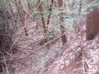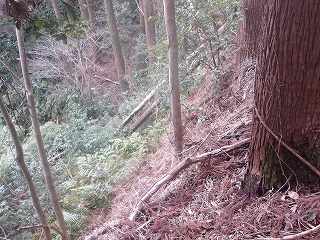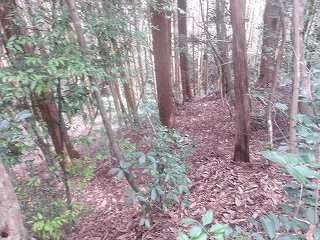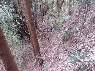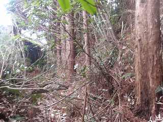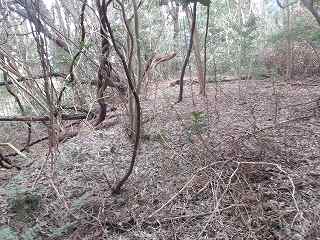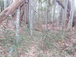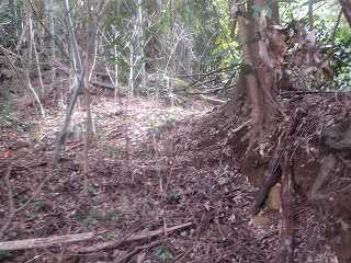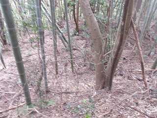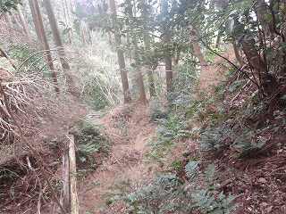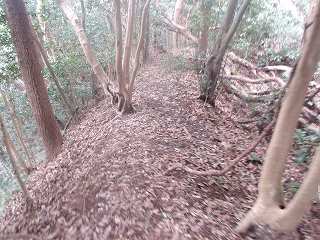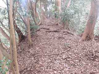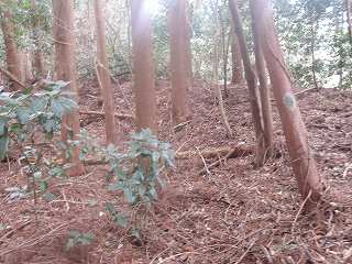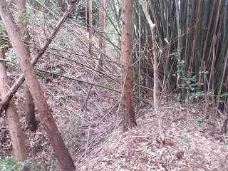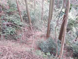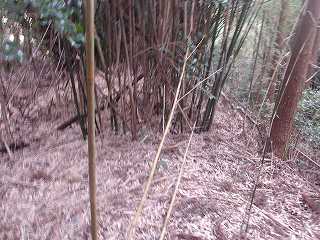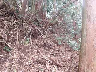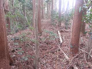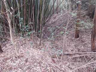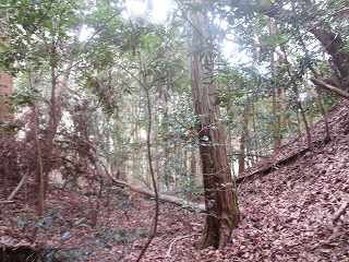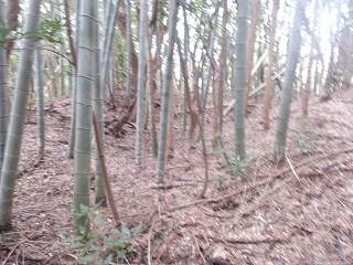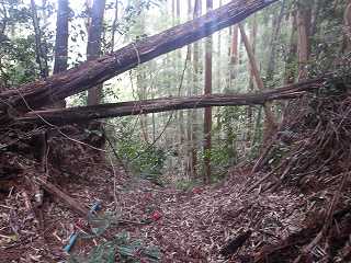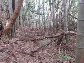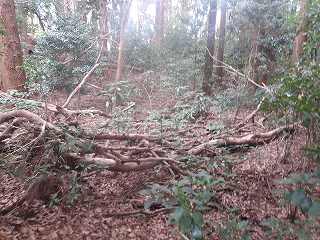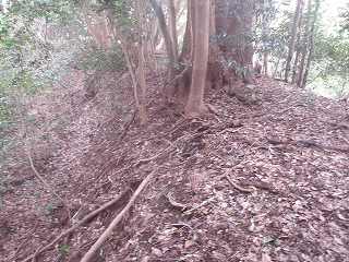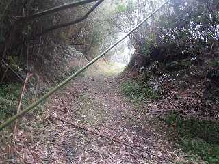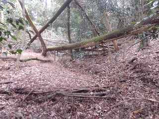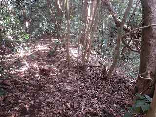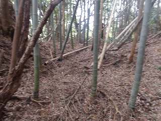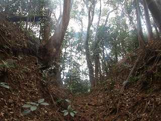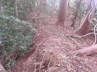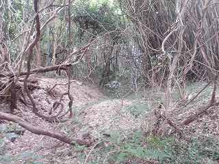 実際の登城道は、1郭と2郭との間の堀切の下辺りから通じていたのではないだろうか。現在、その部分は猛烈なヤブになってしまっているので、とても通り抜けることはできなくなっている。