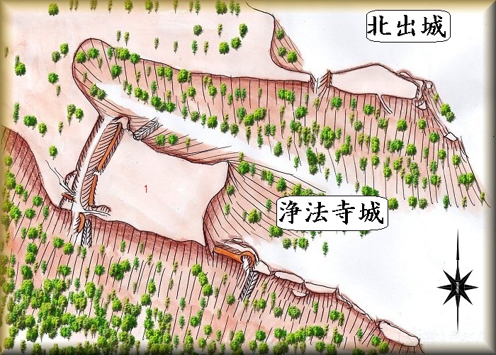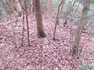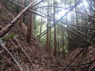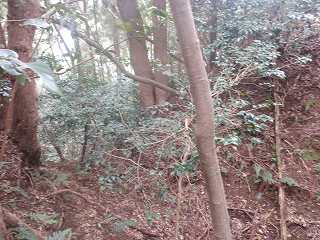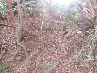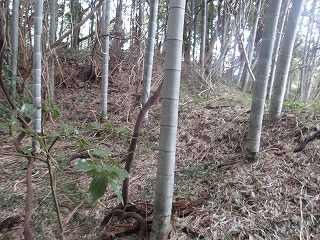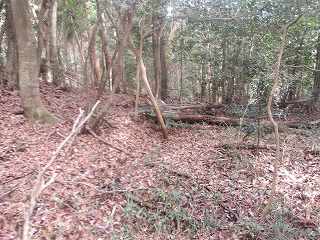 そこから背後の山稜に取り付いて行く。特に道はないが、それほどヤブでもなく、斜面を直登して行くと、浄法寺城の1郭西側にある堀切の所に出ることになる。