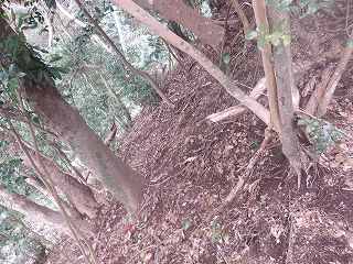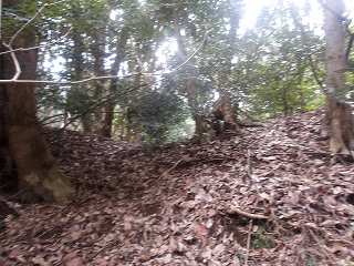 この側面部からよじ登って行けば1郭に入れるのだが、急峻な斜面であり、登るのには一苦労する。