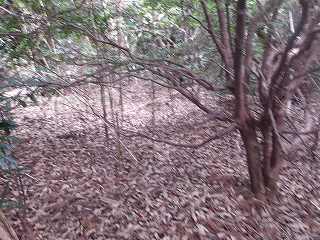 『宮崎県中近世城館跡緊急分布調査報告書』の図面を見てみると、南側から登城道が付けられているようである。ということで、南側辺りから登れるところがないかどうか探してみたのだが、どうにも道は失われてしまっているようであった。