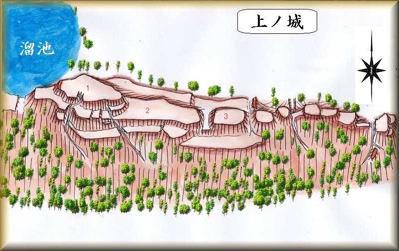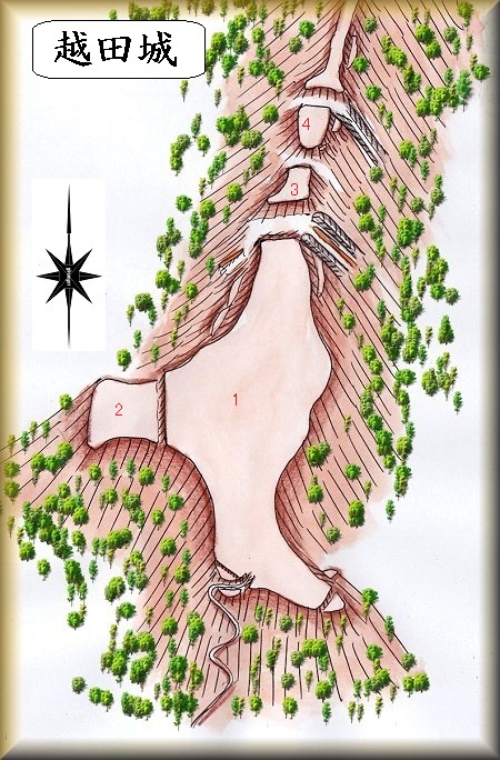 最高所にある1郭から、地形なりに2,3郭と、段々に郭を配列し、側面部には腰曲輪を配置するといった形態の城郭だったようである。
