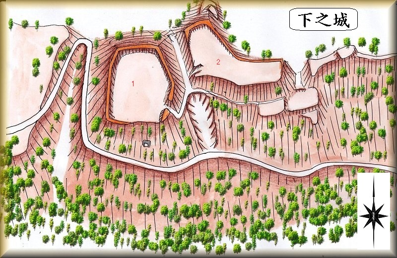 下ノ城は、上の城の東方1,2kmほどの所にある。上ノ城、下ノ城といった名称から、上ノ城に関連した施設であったかと想像していたのだが、形状はまったく異なっており、同一築城主体の城と見てよいのかどうか判断に迷うことになった。