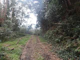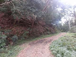 下ノ城と台地基部とは谷戸部分によって切り離されている。林道は1郭の城塁の脇を沿うようにして台地上の畑に上がって行くようになっている。