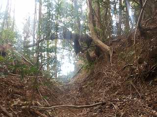 虎口状の部分に入り込んで行くと、3郭手前の堀切の所に出た。幅、深さ共に規模の大きな堀である。最初からこの規模であるから、かなりの大規模工事が施された城郭であることが分かる。これは期待が持てそうだ。