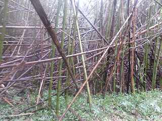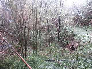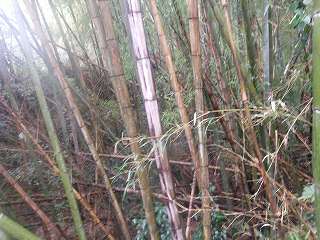 ところが、そこから先は猛烈なヤブ状態となっていた。晴れていても踏破の難しそうなヤブなのに、土砂降りになってしまったので、とても入り込むことはできない。残念ながらここで撤退することとした。