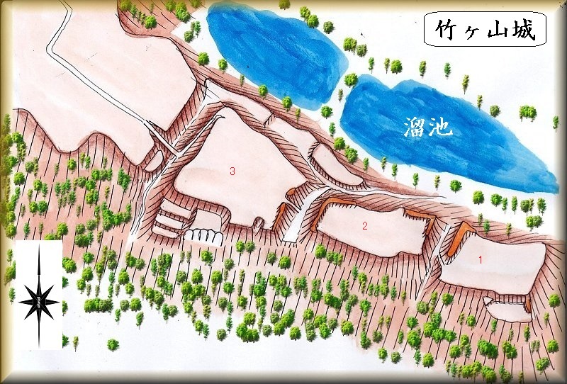 竹ヶ山城は台地先端部を利用して3つの郭を連郭式に配置した城であった。北側の山麓下には溜池があり、天然の堀となっていた。
