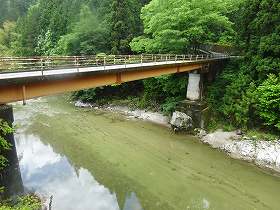 | 北側の集落から遠望する権現城。中腹の熊谷家は、根古屋であったと思われる。 | 和知野川に架かる橋。この端の手前に案内板がある。橋を渡って右手に登って行く。 |