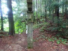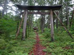 鉄塔の先を進むとすぐに鞍部が見えてくる。ここに石造りの鳥居が建てられていた。ここが堀切跡ということであるが、鋭さに欠けており、深さも3m程度のものである。ただし堀幅は広い。