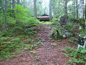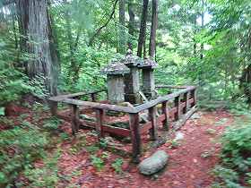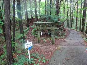 | 熊谷家から登り始めたところにある墓地。古い五輪塔もある。 | 3郭先端部に建てられている鳥居。 |