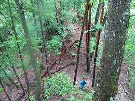 その先に進んでみてびっくり! そこには深さ10mほどもある堀切が見られた。背後の尾根を分断するためのものであるが、それにしてもこれだけの深さの堀切には驚かされる。対岸の尾根が同じ高さにあることからすると、鞍部だったわけではなく、人工的に削り落としていったものであり、かなりの大工事であったと推測される。急斜面脇の工事はかなり危険であり、住民が離反した築城工事というものには、こうしたものも含まれているのではないだろうか。