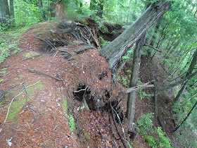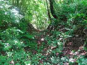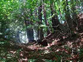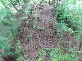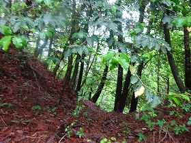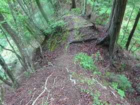 | さらに先の山稜が上がっているところにある城址末端の堀切。 | 尾根の側面部はえぐれた崖となっている。 |