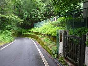 | 林道の途中から見えてくる八幡城。 | 早稲田配水場。この先から登って行った。 |