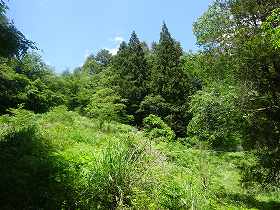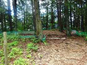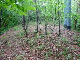 | 最初にあった電柱の建てられている平場。ここが郭かと思ったのだが、実際には城域はずっと先である。 | 最初に見えてくる小規模な堀切。中央を土橋として削り残している。 |