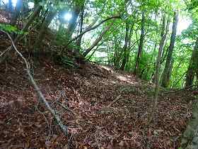 | 2郭への尾根には土塁が造成されている。 | 2郭へ続く尾根。先方が2郭。 |