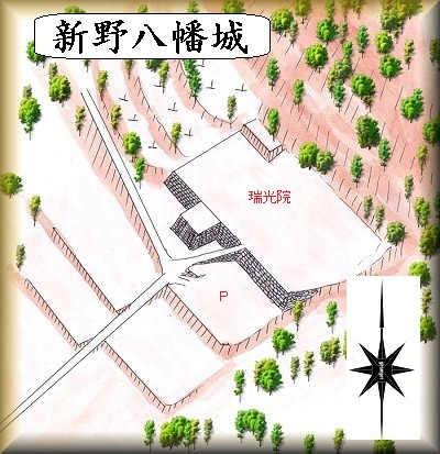 阿南町新野にある瑞光院が、新野八幡城の跡である。したがって、この寺院を目指していけばよい。下の国道151号線を走っていると、途中に瑞光院の入り口案内があるので、そこから上がって行けばすぐに寺院に到達する。